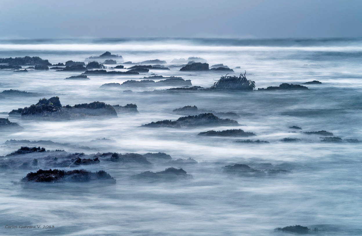 Les presento esta foto hecha en marzo de este año en la costa central de Chile en un día muy cerrado, de mucha niebla. Recorrí largamente esta playa buscando la composición que quería, y la encontré en estas rocas danzantes, flotando desprendidas en un mar sinfónico de arena, agua y espuma.