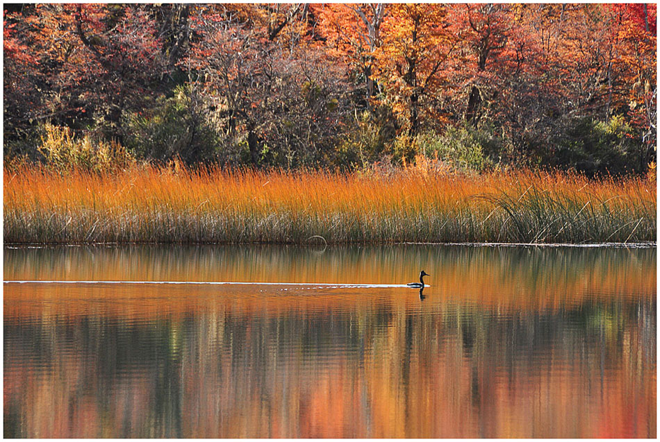 Bienvenida querida amiga...me alegro mucho que te sumes con tus lindas fotos a este sitio. Presentación más que gustosa con esta formidable imágen. El Macá nadando entre esos colores otoñales, con toda una laguna para él. Un besote.