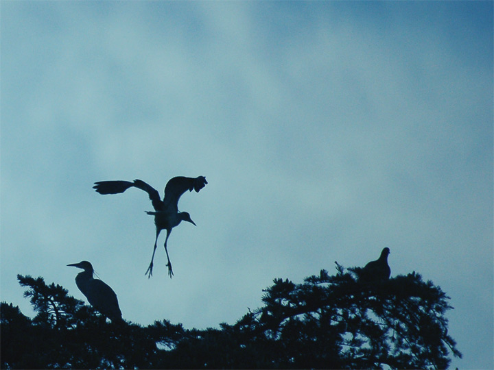 Un atardecer en Gral. Rodriguez, Prov. de Buenos Aires me regaló unas garzas en contraluz compartiendo la copa de un pino con una paloma.