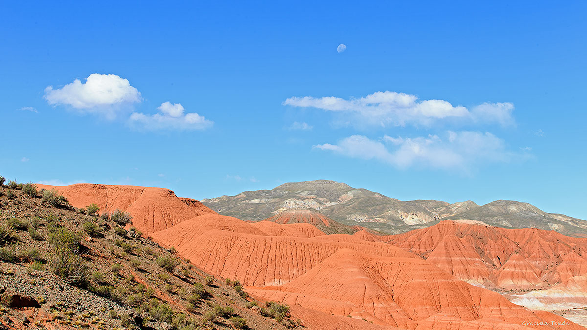 Los planos muy atractivos Graciela, las nubes aportan interés en ese cielo con un color muy bien controlado, bello el detalle de la luna. En mi monitor veo líneas horizontales quizás producto de edición y rojo de los cerros algo sobresaturados. En el contorno de los cerros también se aprecia una luminosidad quizás producto de edición. Como sea ... una imagen muy bella y de mucha energía. Saludos!!