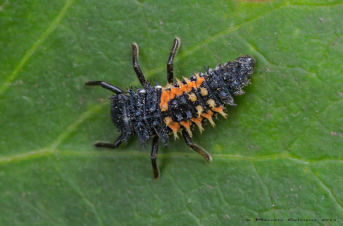 Hola Marce! el ciclo que siguen estos bichos es: huevo, larva (muchas veces tienen varios estadíos larvarios), pupa (el nombre viene por el parecido a las muñecas griegas) y el adulto. Lo que foteaste es una larva de una mariquita, caracterizada por su gran voracidad. Excelente toma, llena de detalles. Abrazo!