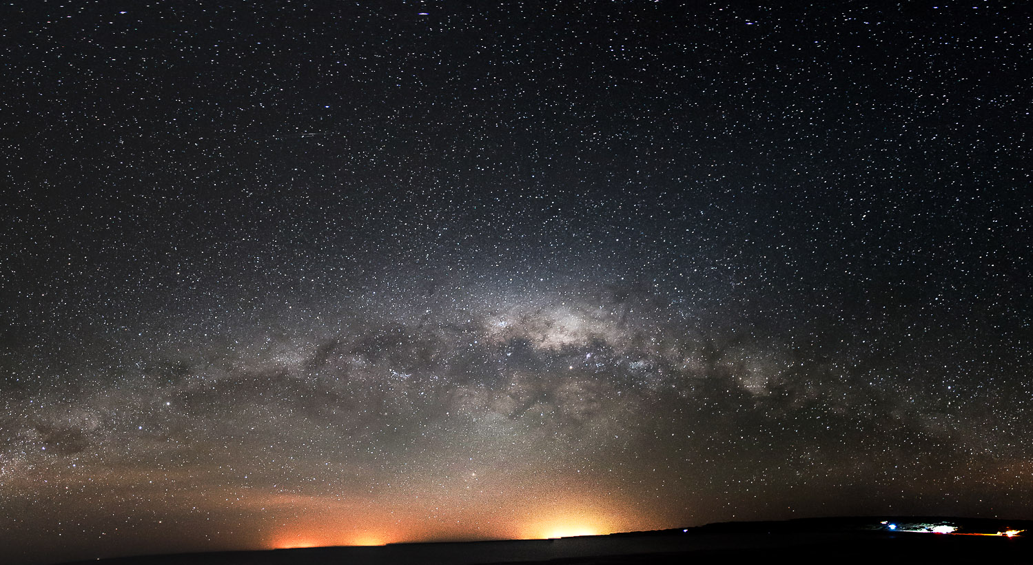 Hola gente, después de un fin de semana sin internet vuelvo a conectarme para chusmear que han subido en éstos últimos días y para compartir una panorámica de la Vía Láctea. En éste caso son 5 fotos sacadas con un ojo de pez en Punta Pardelas, Península Valdes. Lo primero que hice fue corregir la perspectiva de cada foto en Lightroom, luego uni las fotos con Hugin para crear la panorámica, exporté como Tiff y edité nuevamente en LR. En la imagen se ven tres zonas de luces, la primera de la derecha y la de mayor intensidad es Puerto Pirámides ya que nos encontrábamos a pocos kilómetros de allí, las otras dos luces creo que son Puerto Madryn y su zona industrial. Espero les guste.