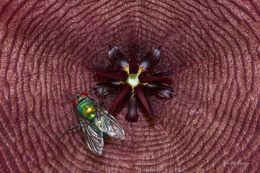 Hola a todos, subo una foto de un detalle de esta flor de Stapelia grandiflora que está siendo polinizada por esta mosca. Esta especie de planta es una suculenta que tiene una flor bastante grande que emite un olor suave a carne podrida lo que atrae a estas moscas que son su principal agente polinizador.