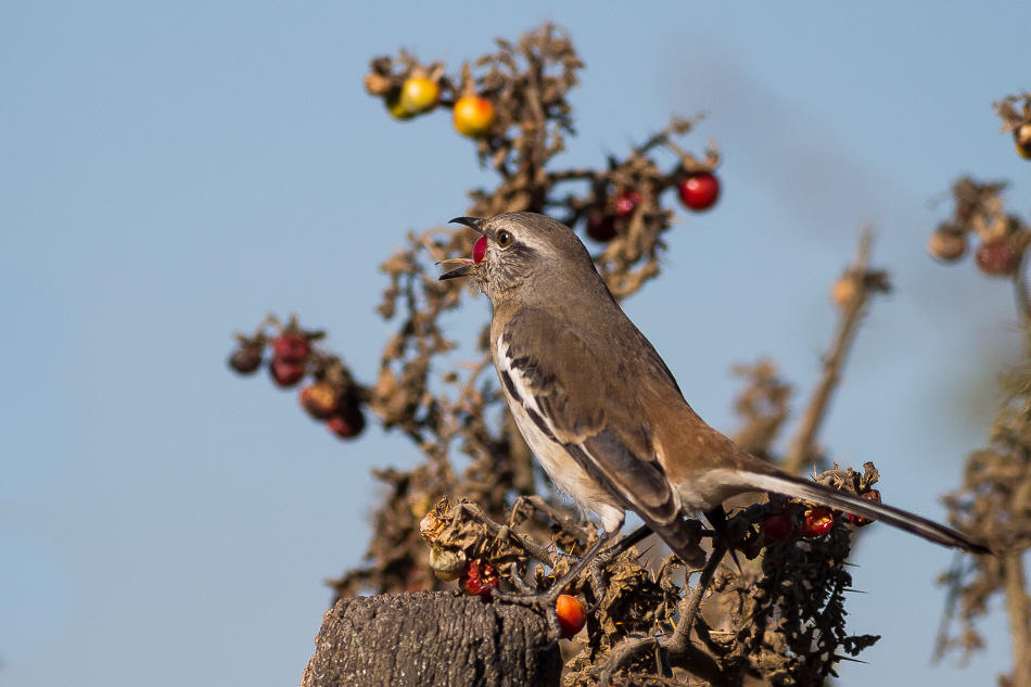 Una calandria real tragándose un fruto de Revienta caballos o Tutiá (Solanum sisymbriifolium) a la vera de un camino rural.
