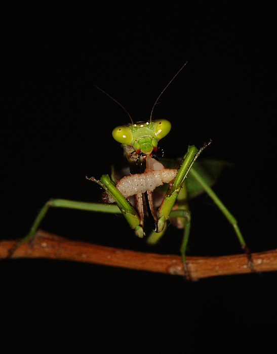 Una toma espectacular por lo fotografico y lo documental del momento captado,la familia de los Mantodea con sus patas raptoras selos puede tomar con presas pero lo raro es con un gusano!! y como lo presenta a la vista del fotografo, no se puede decir el genero pero la mas comun es el Stagmatoptera hyaloptera que cuando es adulto presenta en dorso sobre las alas una imagen similar a un ojo felicitaciones!!!