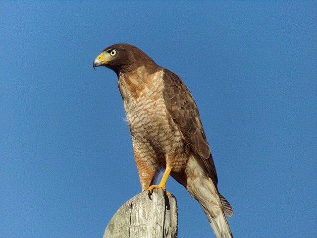 Se posa erecto en postes o árboles. Gritón.