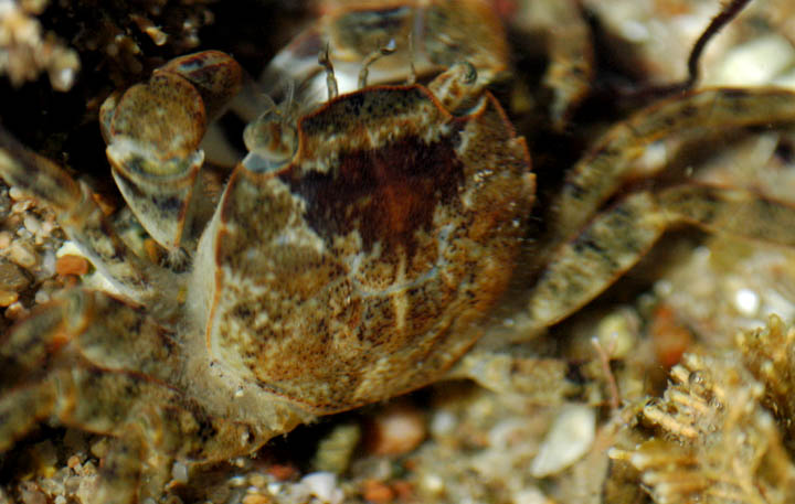 La inexperiencia es lo que creo que le dejó varado entre las rocas, descubiertas, por que bajo la marea, y mirando entre los rincones uno siempre encuentra algo, este cangrejillo estaba en una pequeña piletilla que el mar con el tiempo ha formado en las rocas y este pobre intentaba salir, y salir, sin tener fortuna. No se si la he colocado en el cuadro que corresponde, sino una simpatica imagen que quiero compartir. Esta foto la hice con el objetivo invertido intentando lograr una fotomacrofotografia. Saludos para todos. la hice en rio negro