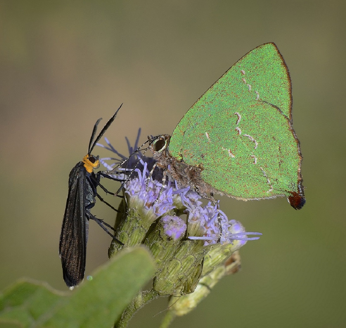 Cyanophys acaste ( Licénido verde) y Ctenucha rubriceps ( Polilla negra)