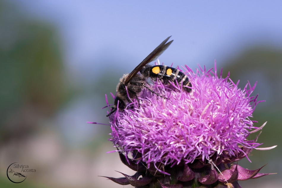 Es una avispa parásita, muy activa, en cada cardo había una. Las avispas recorren circularmente la flor y su cabeza siempre aparece hundida entre los múltiples estambres de las flores que componen esta inflorescencia para aprovechar al máximo su polen.