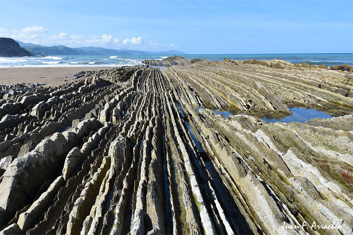 Las capas duras, al quedar expuestas, son también erosionadas, al tiempo que dan algo de protección a las capas blandas. Se trata de un proceso de erosión diferencial y el resultado a la vista es como el de Este paisaje de capas rocosas, a modo de milhojas bañadas por el mar, es el que domina en esta ruta costera que va desde Zumaia a Deba .Los flysch de este tramo costero del País Vasco,los acantilados de Itzurun, se extienden a lo largo de 8 km de costa y aunque tan solo te serán visibles unos 200 o 300 m de los mismos hacia el mar, su extensión total es de unos 5 km mar adentro.