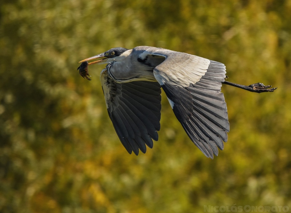 En el muelle de la RECS, intento fotografiar una Garza Mora, cuando obtengo la foto, me Doy cuenta que la enganché con su comida en el pico, con una chanchita de rio, volando a un lugar alejado de los caranchos