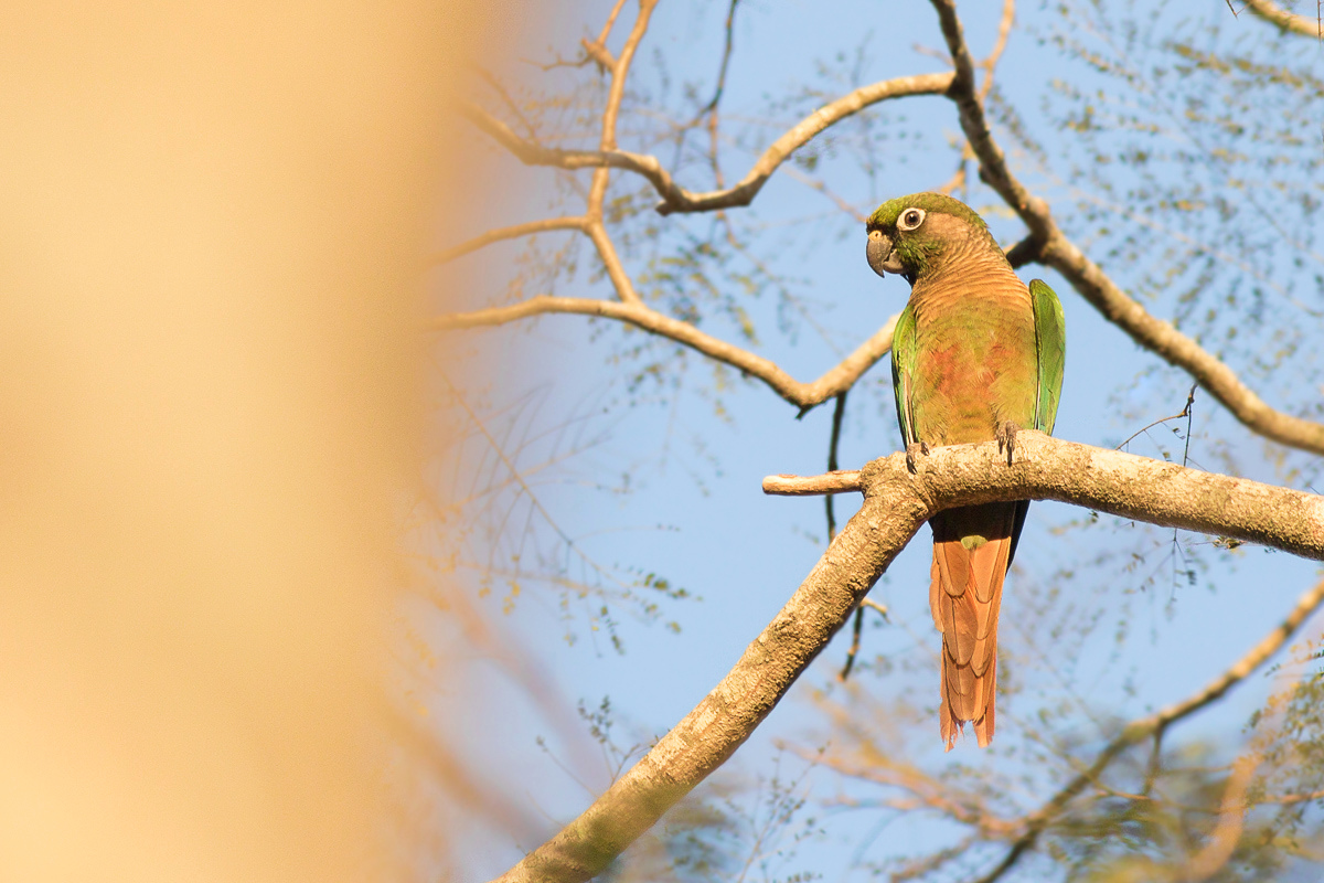 Ya regresando de un sendero del Parque Nacional Chaco donde en pleno julio nos comieron los mosquitos (duros los inviernos del Chaco, ja ja) encontramos a este solitario Chiripepé Cabeza Verde, perchado en un gran árbol que suelen usar los habladores para congregarse al atardecer.