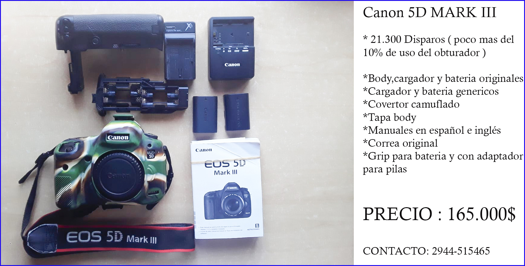 LIQUIDO EN 130.000$   BODY 5D MARK III....  21.300 DISPAROS ¡  ME QUEDO SOLO EL BODY + EASY COVER (CAMUFLADO) + CARGADOR Y BATERIAS ORIGINALES + CARGADOR Y BATERIA GENERICAS, GRIP GENERICO MAS ADAPTADOR PARA USAR CON PILAS+ CORREA ORIGINAL+ TAPA BODY ORIGINAL+MANUALES EN INGLES Y ESPAÑOL .....  EXCELENTE ESTADO GENERAL FUNCIONAL Y ESTETICO ¡¡¡¡¡¡¡¡