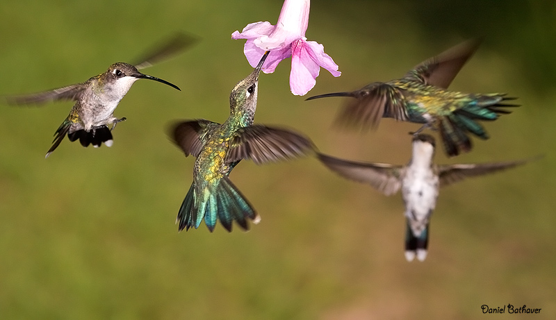 El valor que tiene esta toma es la dificultad que plantea fotografiar mas de un colibrí en una misma foto, y luego de muchas horas y descartes, logré esta foto. Con esta concluyo la serie y en la misma se pueden observar dos hembras y dos machos. Me hubiese gustado que estuviesen todos en foco, pero técnicamente es casi imposible.
