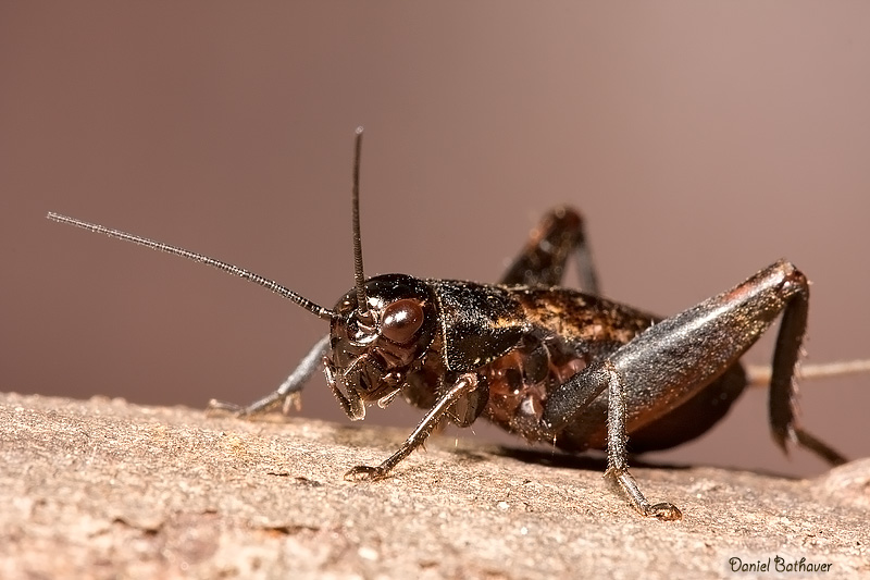 Hola a todos. Hace unos días adquirí un lente macro (lo compre al amigo Abel Valente miembro de FN). Apenas lo recibí hice unas pruebas, un verdadero desastre, despues leyendo el manual del lente comprendí como usarlo. Despues de unas pruebas con cosas pequeñas inanimadas quise intentar con un sujeto vivo, increible, me la pase 3 días buscando bichos. No hay ni hormigas por el frío. Abajo de una garrafa encontre un grillito de 1 centimetro de cuerpo y dije aca esta. Bueno como pude arme el tripode y con la ayuda de mi hijo para tener el segundo flash y mi nena con un velador alumbrando el grillo pude hacer unas tomas, entre las cuales saque esta que me pareció se puede mostrar. Es un terreno que no manejo, asi que sugerencias seran bienvenidas.