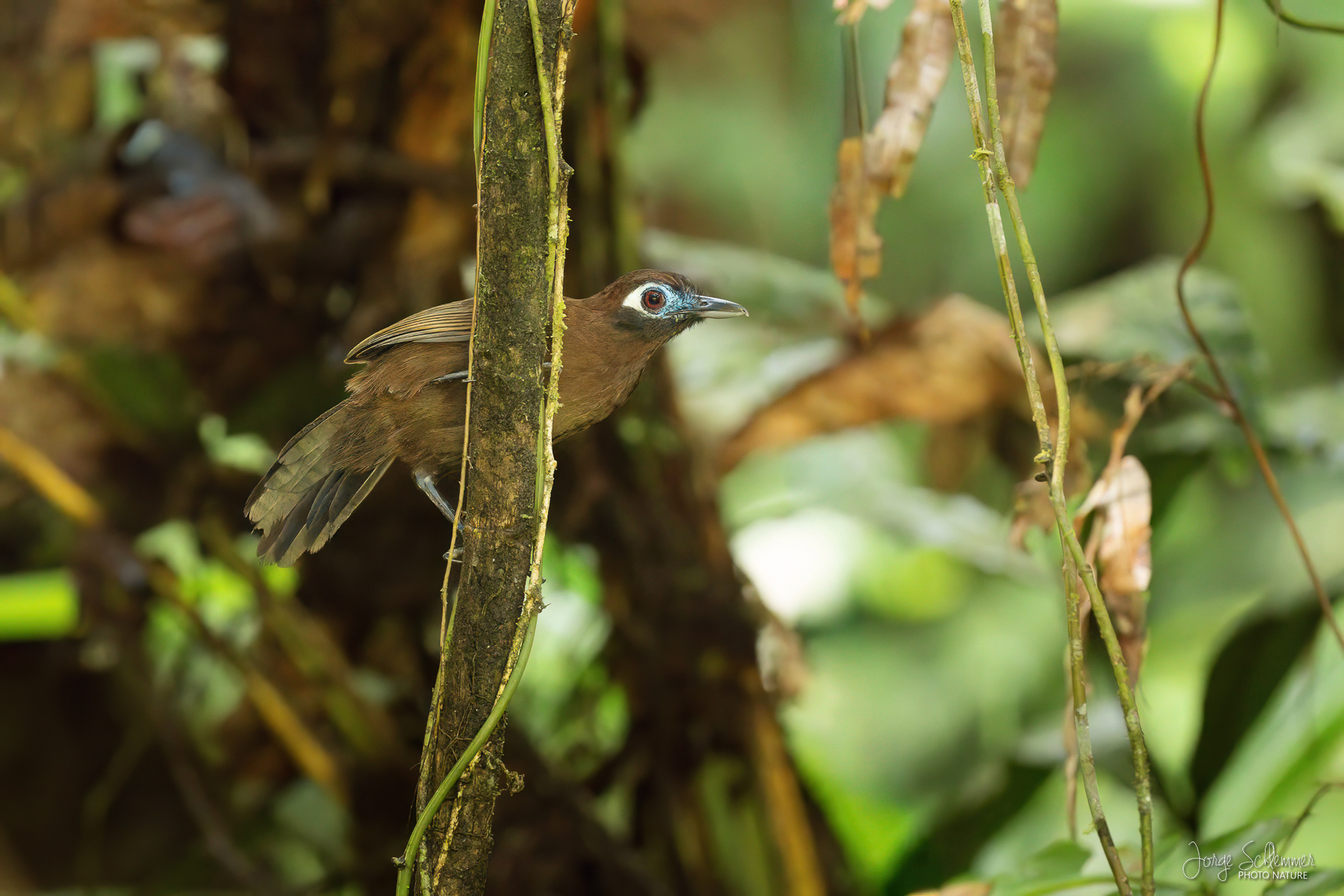 El Hormiguero de Zeledon es un ave hormiguera de gran tamaño y plumaje uniforme; el macho es totalmente negro y la hembra (foto) es marrón oscuro.