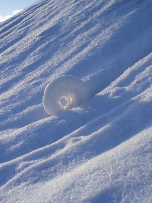 Esta foto la tomé en el Cerro Perito Moreno, a unos 25 km de El Bolsón. En realidad no podía creer que esa "rosquita" fuese un fenómeno que ocurre naturalmente cuando por algún motivo, una piedra, hojas, o algo de hielo caen y empiezan a rodar pendiente abajo.