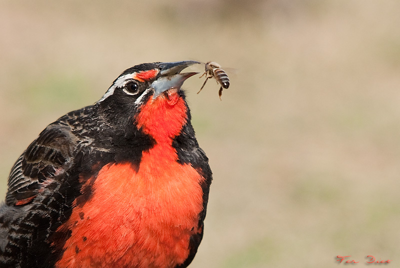 Una belleza,la abeja está atraída quizá por algún alimento que la loica tiene en el pico,algo dulce,en cambio al ave no se la ve intimidante,mas bien perpleja, ante ese visitante molesto,las aves no atacan a las abejas o a veces en raras ocasiones,solamente vi un día en una de mis colmenas una pareja de horneros,comiendo debajo de la piquera las larvas muertas arrojadas por las abejas,producto de una enfermedad,te felicito Fernando.