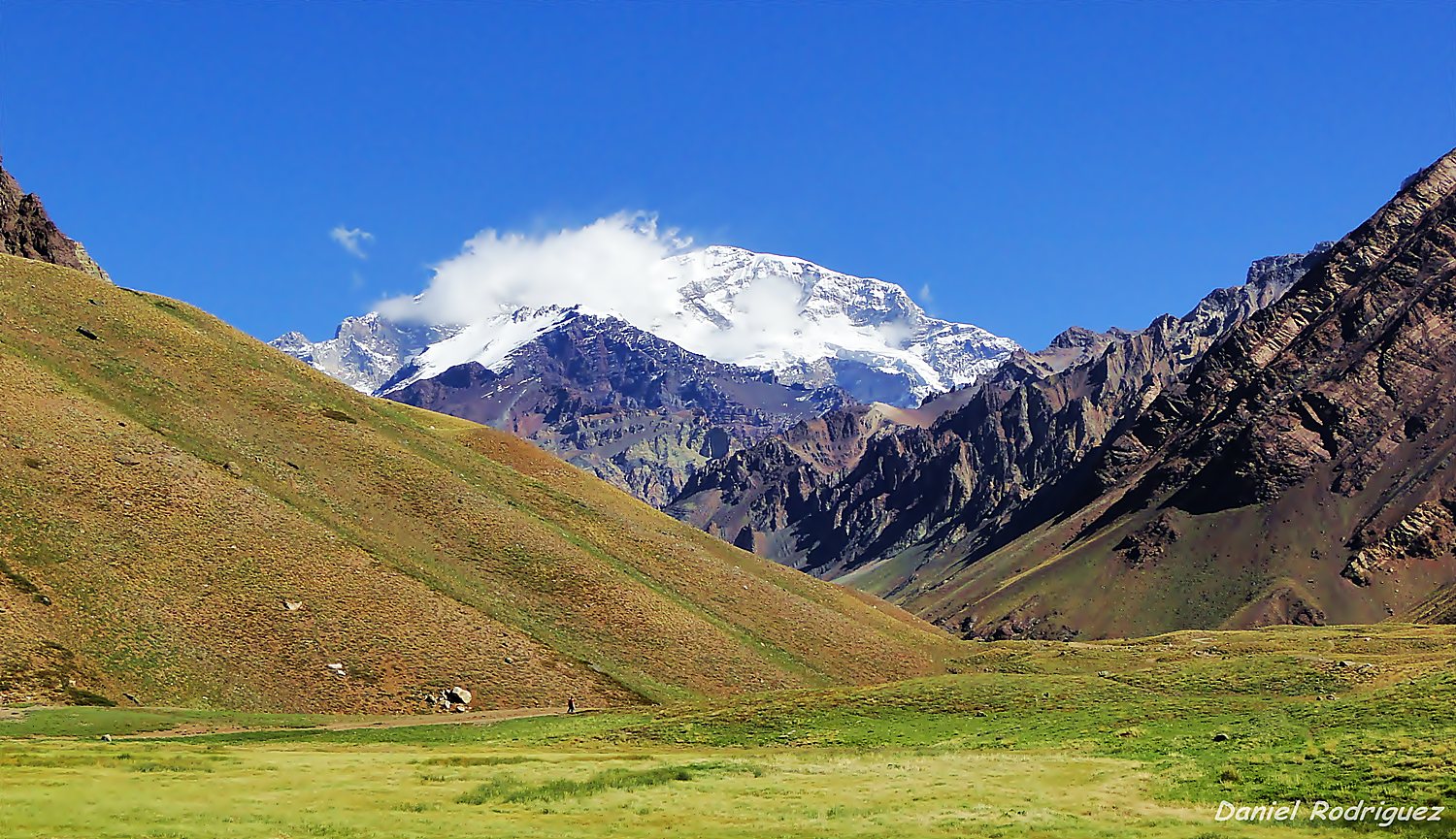 a desafiarlo, algunos lo logran. Este es el mas grande de América, El Aconcagua que aparece soberbio con sus casi 7000 metros. Esta foto muestra la pared sur que según dicen los andinistas, es la mas peligrosa. La vista es desde la laguna Los Horcones, tomada el domingo último, a la izquierda hay una persona que comparativamente nos da una idea de lo impresionante del coloso.-