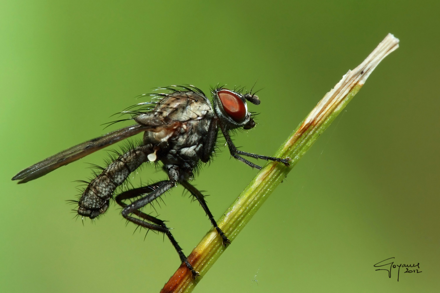 Expectacular mosca peluda, a mi me gusta mucho con luz suave del día nublado, los dias nublados para mi no son feos y los considero clave para hacer macros, enhorabuena por el fondo y por la nitidez conseguida con el f/18.