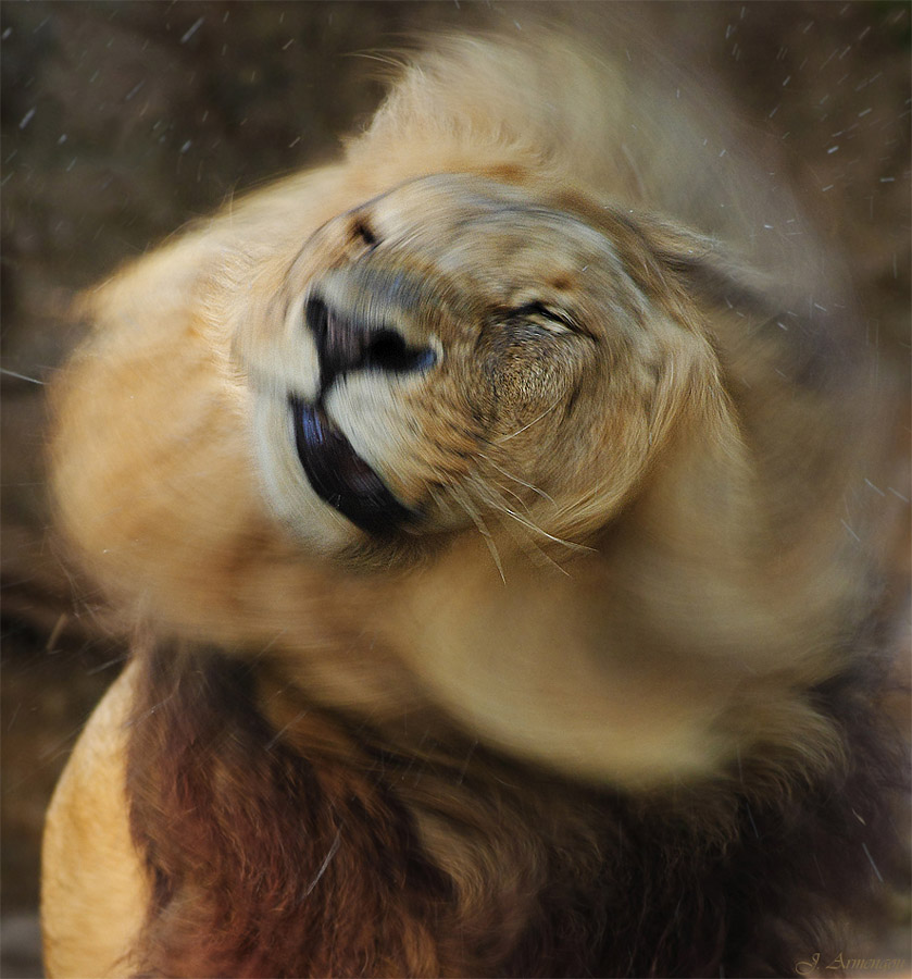 Muy buena imagen. Ellos también se sacuden casi como un gorrión!! Vaya a saber la de insectos que tendrá en esa melena. Muy dinámica la toma y con un tema distinto.