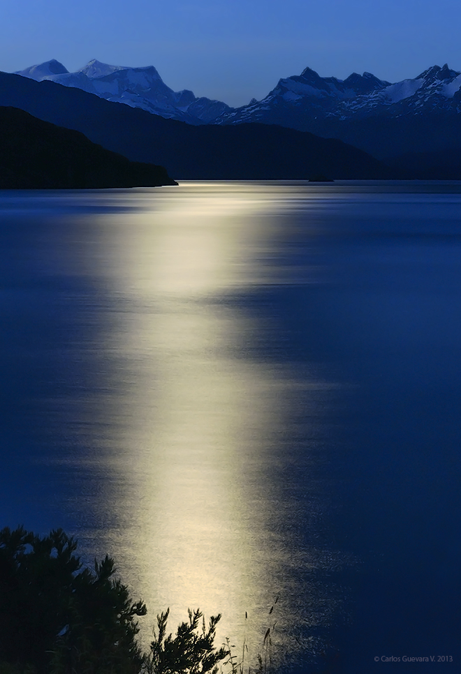 bellos azules a los que dirije ese hermoso sendero de seda....buena elección de composición dejando la luna afuera ya que es muy tentador incluirla en la toma siempre...pero en esta toma usar su reflejo da una sensación de serenidad por lo suave de las luces que, como ya dijeron otros, atrapa. Felicitaciones! Un abrazo!