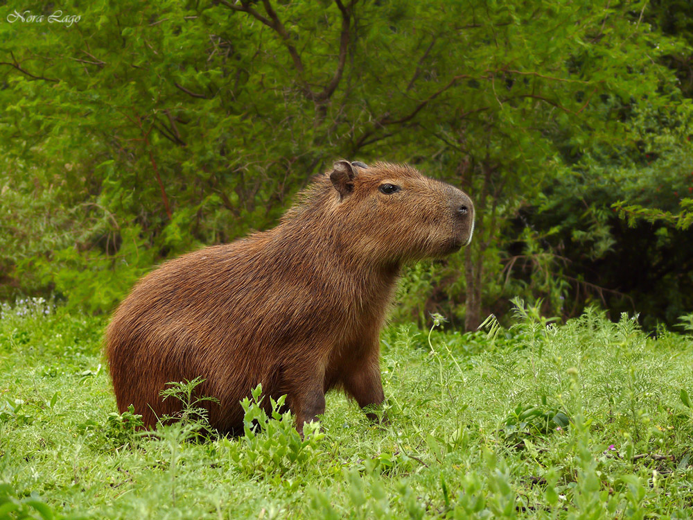 Muy buena Nora. Me parece que al mirarla uno asimila los arbustos de atrás como árboles y entonces agiganta al Carpincho. Muy buen punto de vista y detalles.