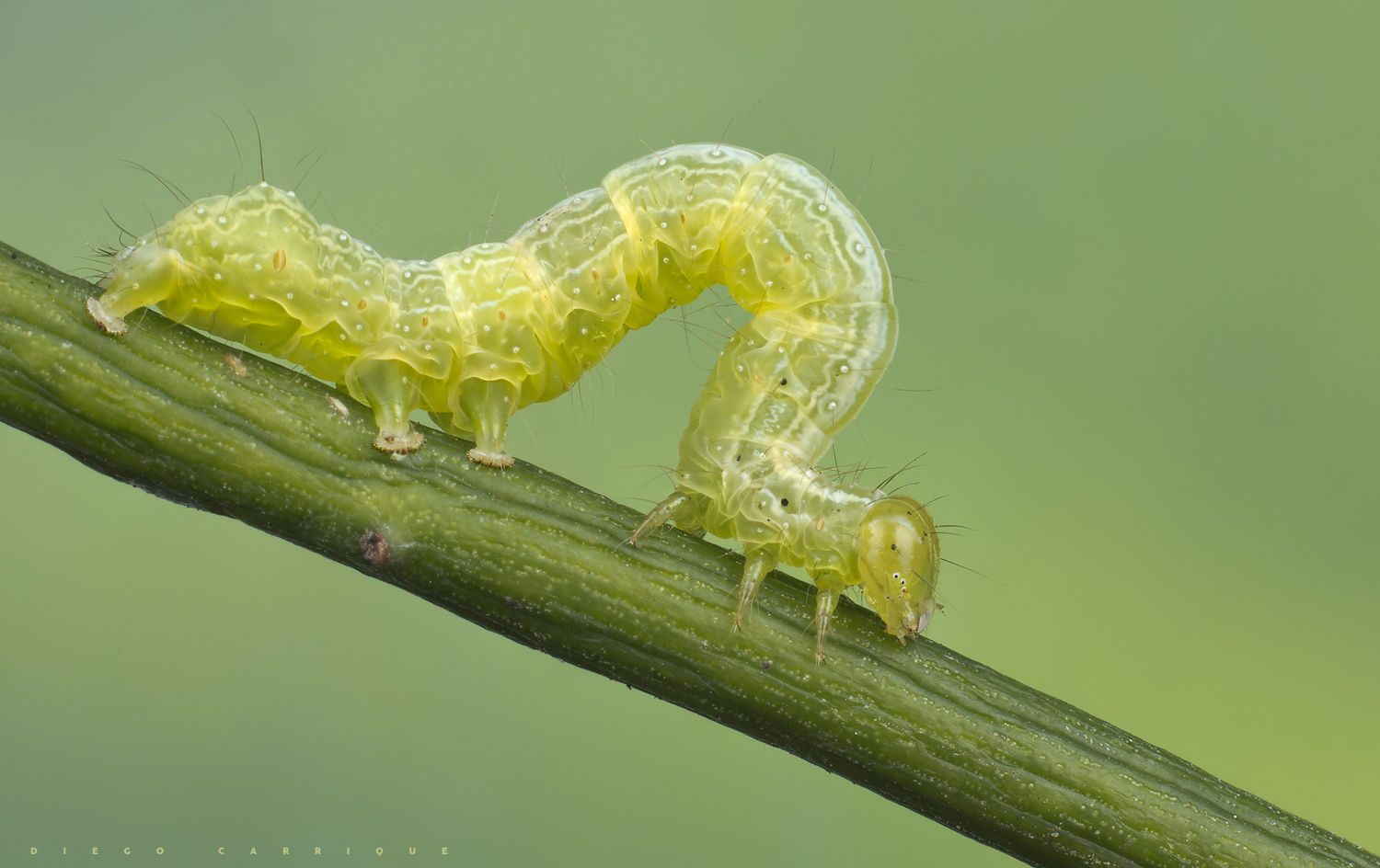 Comparto esta foto de una oruga de Autgrapah gamma, probando un seteo diferente para la iluminacion macro con dos flashes externos bien livianos, uno a cada lado de la camara y sostenidos por un brazo doble flexible. Los flashes son de los baratos, marca Viltrox, pero que funcionan muy bien controlados por el flash de la cámara en modo esclavo.