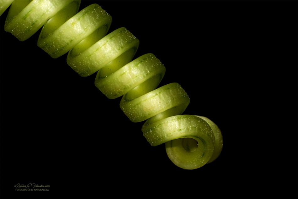 Esta belleza es un zarcillo de una enredadera passiflora. Alguna especie como la mburucuyá. La foto la tomé un día soleado y la planta se enredaba alto entre árboles. Como la forma me gusta y aún más con fondo negro, me la sostuvieron porque había un poco de viento y estaba alto y, con un flash a poca potencia, salieron unas cuantas fotos como ésta. Y alguna más enredada. Me encanta hacer un poco de arte con algo pequeño o diminuto, como un pedacito de una planta que ni siquiera solemos mirar, porque se enreda, en este caso a lo alto, en otros, bien bajo, en diferentes lianas o como se llamen y son de alrededor de sólo 10 mm de diámetro, si mal no recuerdo. La foto está ahí, latente. Sólo hay que sacarla a la "luz".