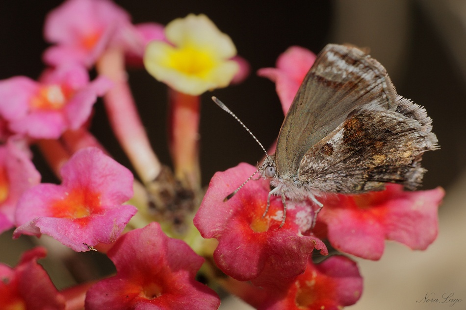 Comparando con el tamaño de las flores se adivina lo chiquita que es la mariposa, bien puesto lo de enana! muy linda foto Nora!
