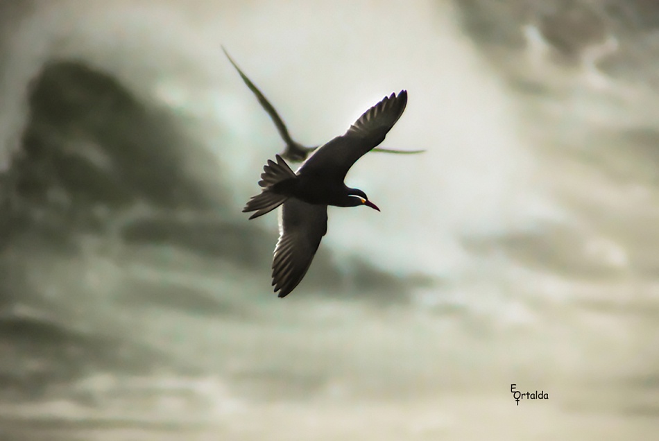 El charrán inca (Larosterna inca), también conocido como zarcillo o gaviotín monja, vuela sobre el mar, cercano a la costa. Ágil en vuelo, se zambulle para capturar pequeños peces.