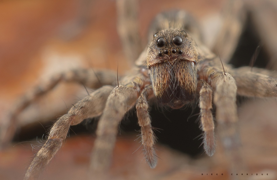 El sabado encontré una araña lobo muy pequeña, solo medía medio centimetro de largo. Despues de varios intentos logré hacerla subir a una hoja seca para tomarle esta foto, la unica rescatable porque la arañita se movía bastante y no le pegué el foco a casi ninguna.
