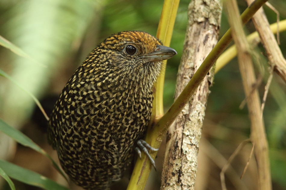 Un retrato de una hembra de Batará pintado, entre la densa vegetación en que vive.