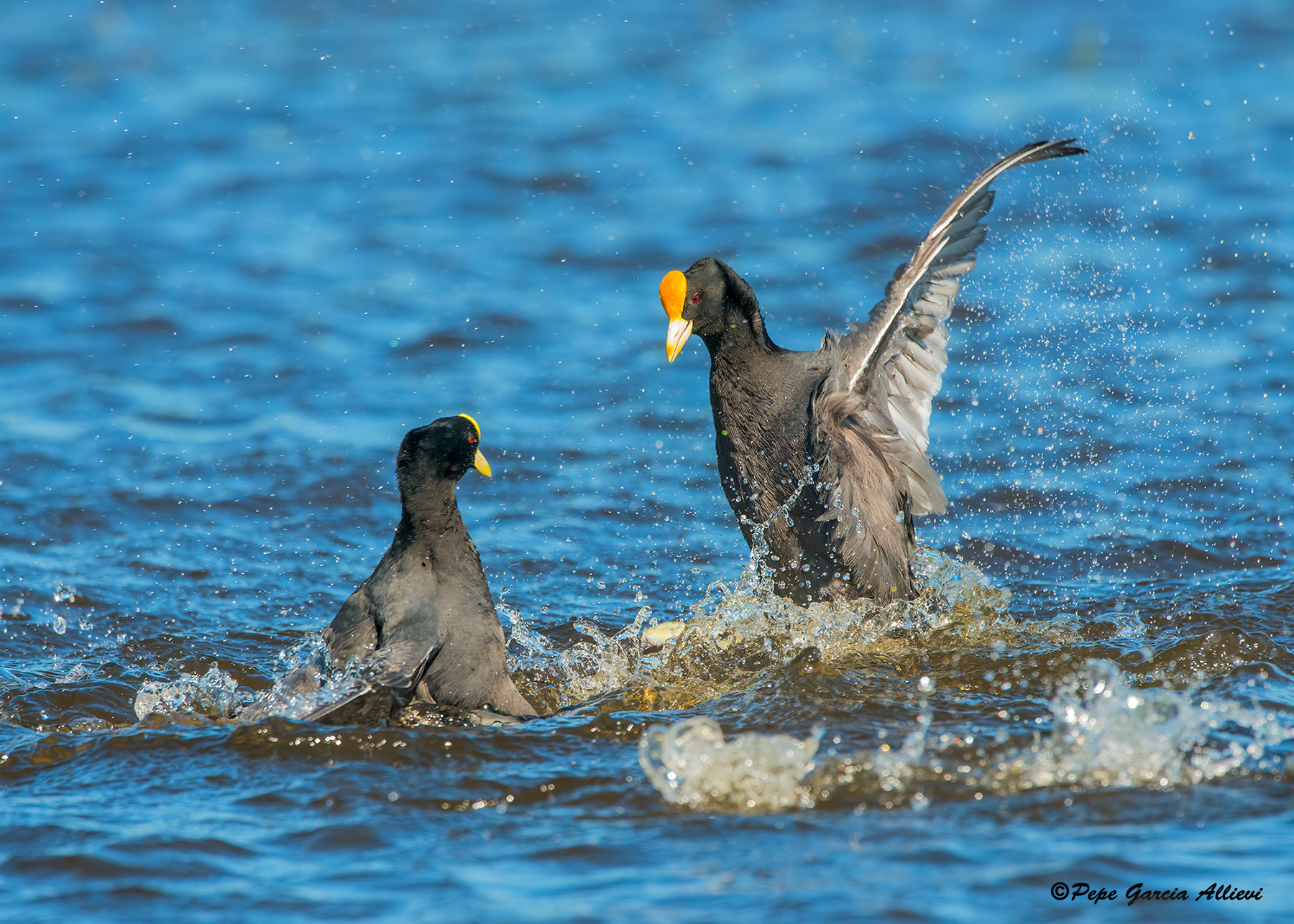 Gracias amigos por los comentarios a mis fotos y haber llevado a mi especie argentina número 300. Hoy una briga entre gallaretas a orillas de la ruta #3 en un alto de un viaje a Villa la Angostura. Al margen dela laguna, monopié, hide con tela camouflada