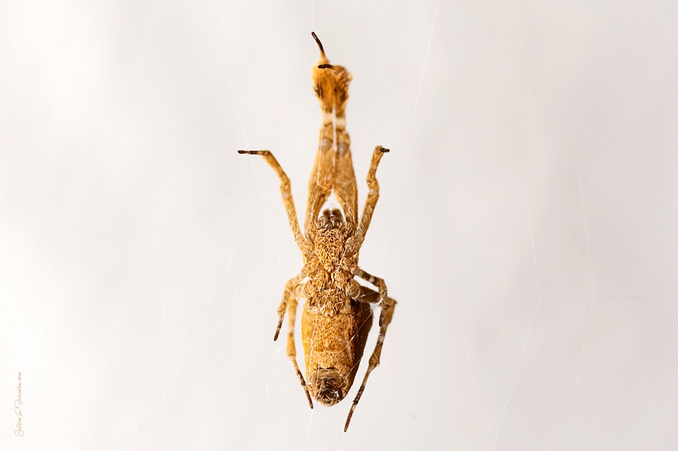 Uloborus plumipes. Una especie que se hizo común en mi terraza. Mide unos 10 a 13 mm y tiene sus patas plumosas. Como comenté en algunas fotos que publiqué recientemente, la especie tiene copada una parte de la terraza, que tiene un pequeño alero. Las empecé a ver un tiempo después de sacar una de la esquina de un techo de la habitación de al lado y ponerla bajo ese alero. Hay varias visibles y sus tonos son un poco diferentes. La foto tiene recorte y originalmente era vertical, usé retoques básicos y sobre y sub exposiciones zonales.