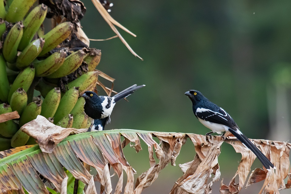 Unas plantas de bananos al costado de camino, y una bandada de fruteros overos, fruteros corona amarilla y celestinos, aporovechando la oportunidad!