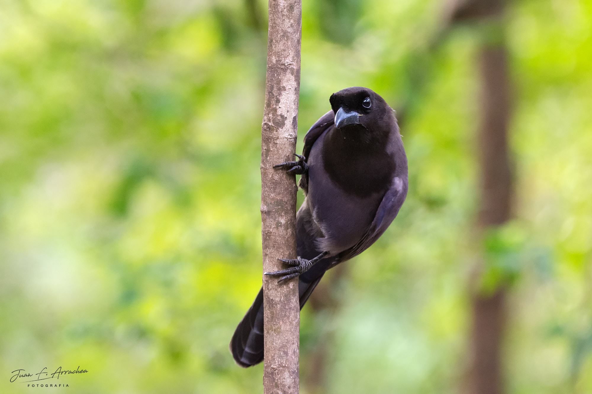 Una de las tantas urracas moradas que visitaban el campamento sobre el Río Apa en Paraguay. Por la vegetación y poca luz generalmente usamos el flash a poca potencia por la cercanía para mejorar el registro. Primera vez que veo la especie.