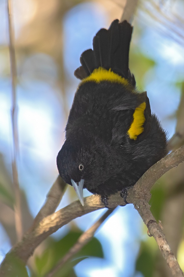 Cuando vocaliza el Boyero Ala Amarilla, hace un interesante mivimiento bajando la cabeza y levantando la cola, edemás de como "inflar" su cuerpo por la expansión de sus plumas....