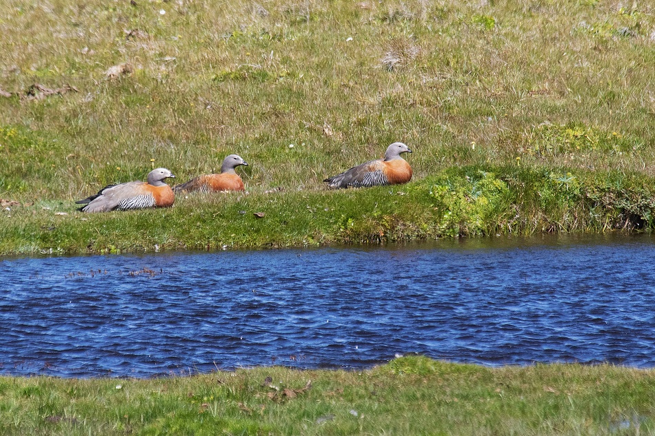 Registro a mucha distancia de tres Cauquenes Reales que pasaban su tiepo junto a un espejo de agua en un humedal junto a la RN3 entre Río Grande y San Sebastián.