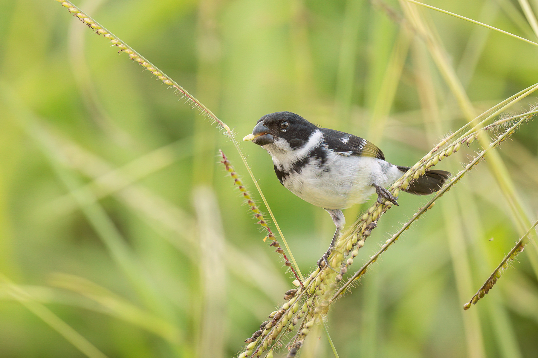 Se trata del Coleiro-do-norte, Sporophila americana o en castellano Semillero Aliblanco, un semillero algo parecido a nuestro corbatita, pero de distribución restringida al NE de Sudamérica.