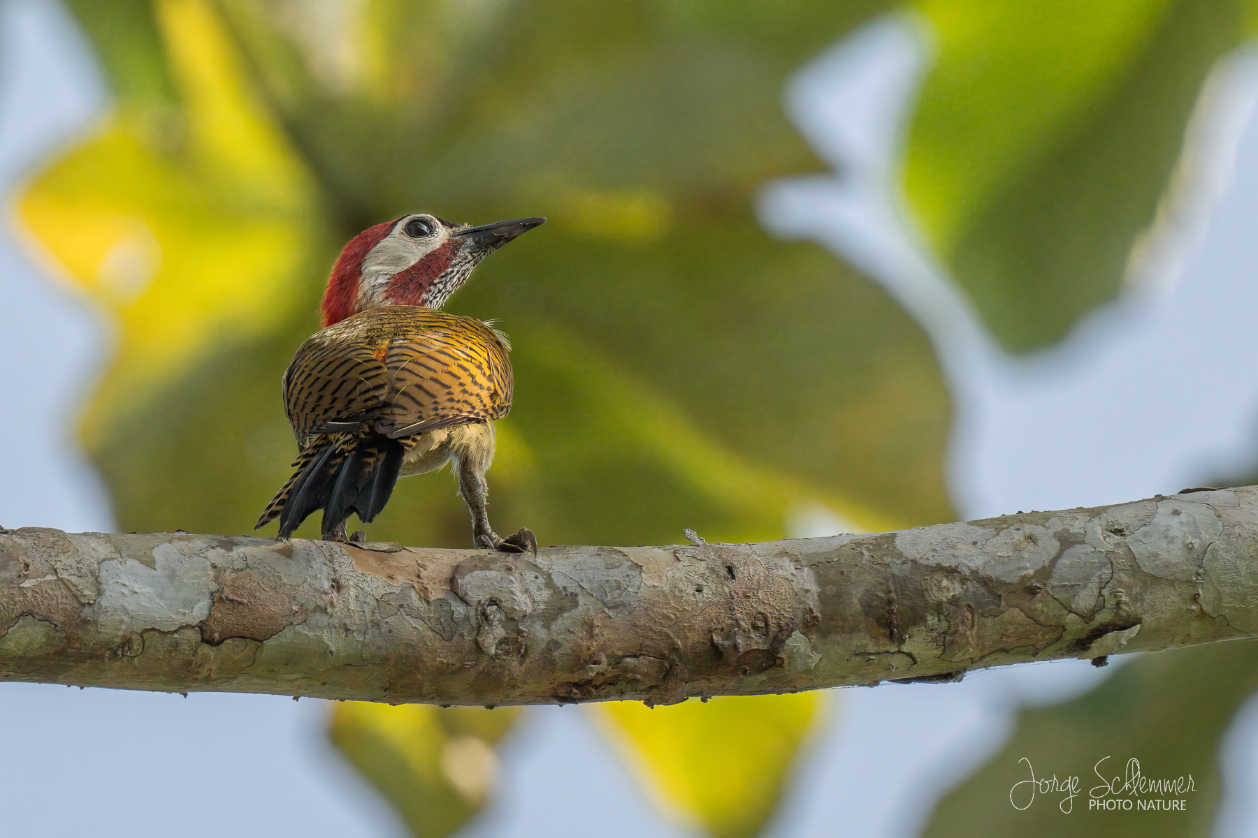 Presenta un patrón de la cara llamativo con nuca roja, frente negra, mejilla blanca y garganta a cuadros; lo encontré muy parecido a nuestro carpintero real.