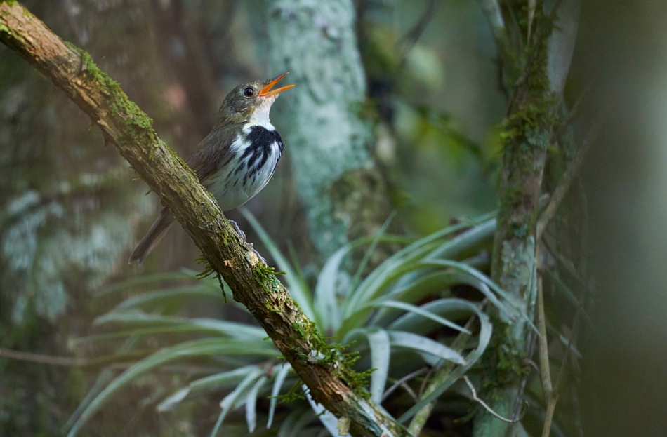 El mosquitero tiene uno de los cantos más distintos de la selva misionera. Este cantaba en un lugarcito regalado para la foto, al lado de una planta selvática.
