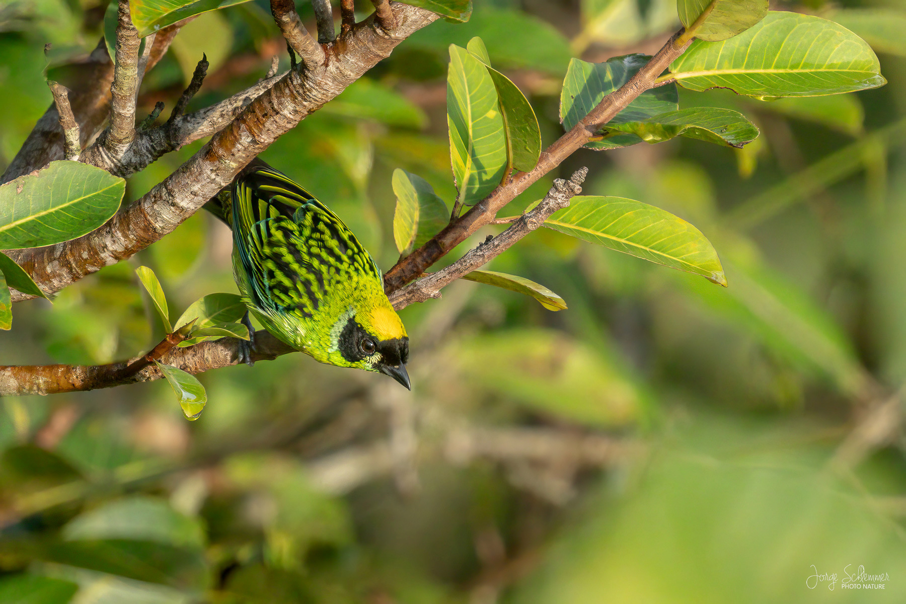 Otra tangara de la Cordillera Escalera, la Tangara Verde y Dorada, mayormente verde con una máscara negra, corona y vientre amarillo.