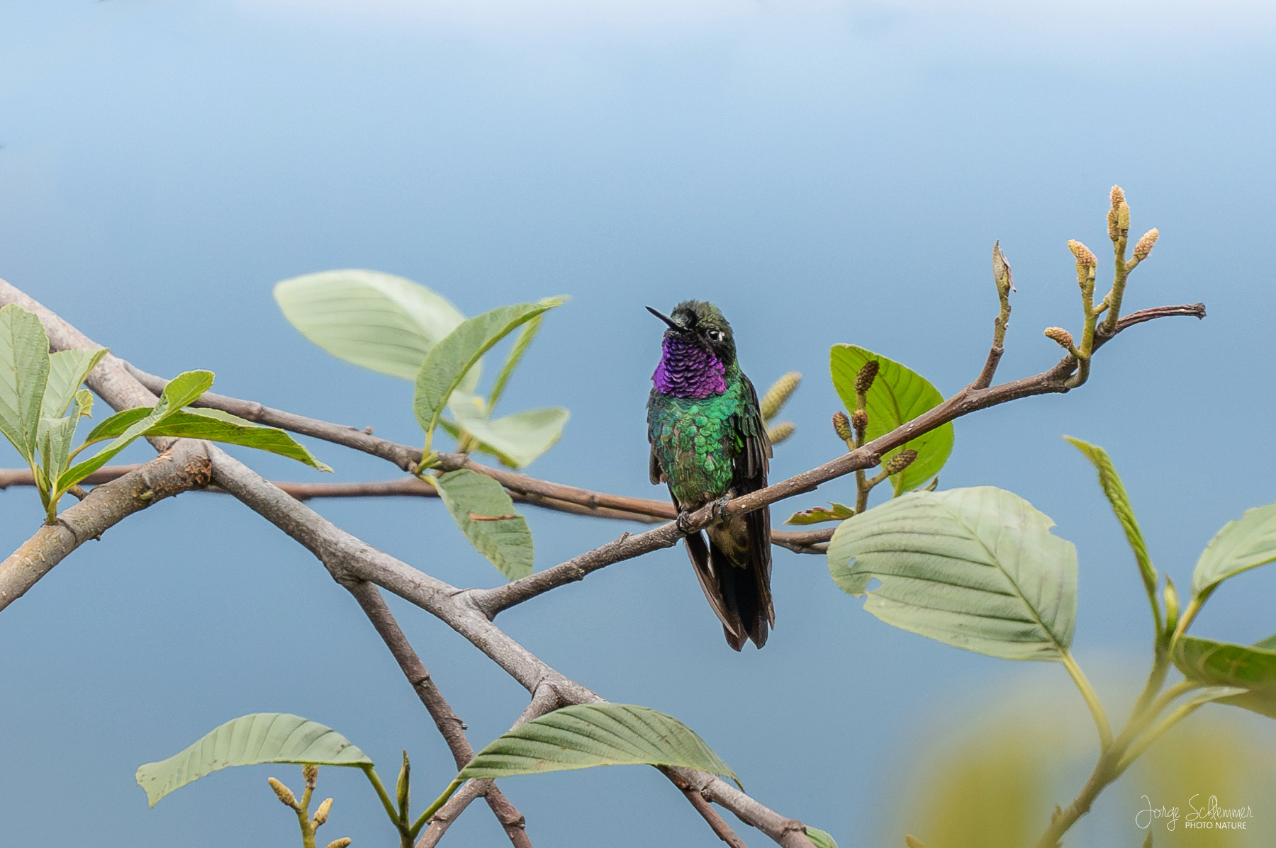 Es inconfundible, de color verde esmeralda y garganta púrpura; pico corto y una pequeña mancha blanca post-ocular.