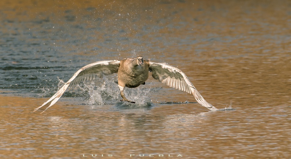 Cisne juvenil carreteando para remontar vuelo , son tan grandes que recorren un buen trecho para lograrlo .. Cerdanya Catalana Girona