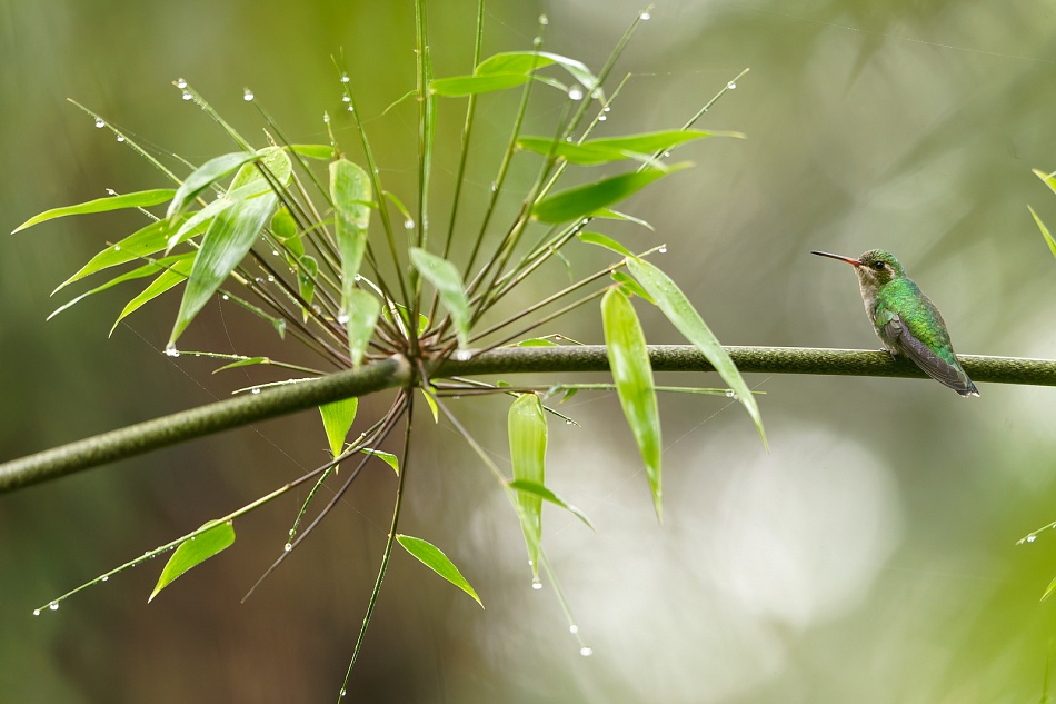 Una hembra de Picaflor verde posada sobre un bambú tacuapí con gotitas de la lluvia de la madrugada anterior. El thumbnail de FotoNat no favorece a una composición como esta, ja.