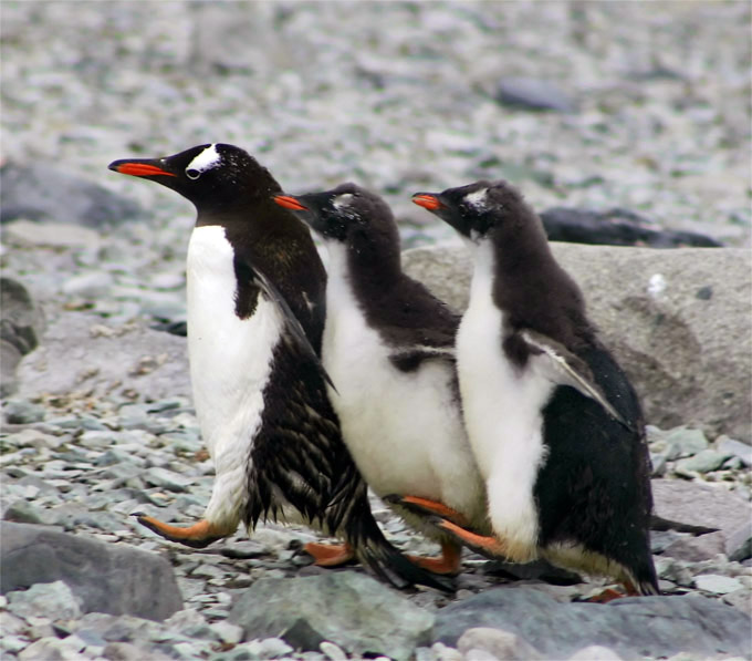 Es muy comun en las pinguineras de Papuas ver a uno o dos pichones haciendo trencito con un adulto, lo loco es que los pichones son quienes empujan. Tal vez alguien lo pueda confirmar pero lo que decian quienes ya habian visitado la Antartida varias veces es que los pichones empujan a los adultos al mar para que vayan a traer comida. Lo que les puedo decir yo sin saber mucho es que los pichones se ponian terriblemente cargosos y solo paraban si el adulto les ofrecia algo de comida de su buche.