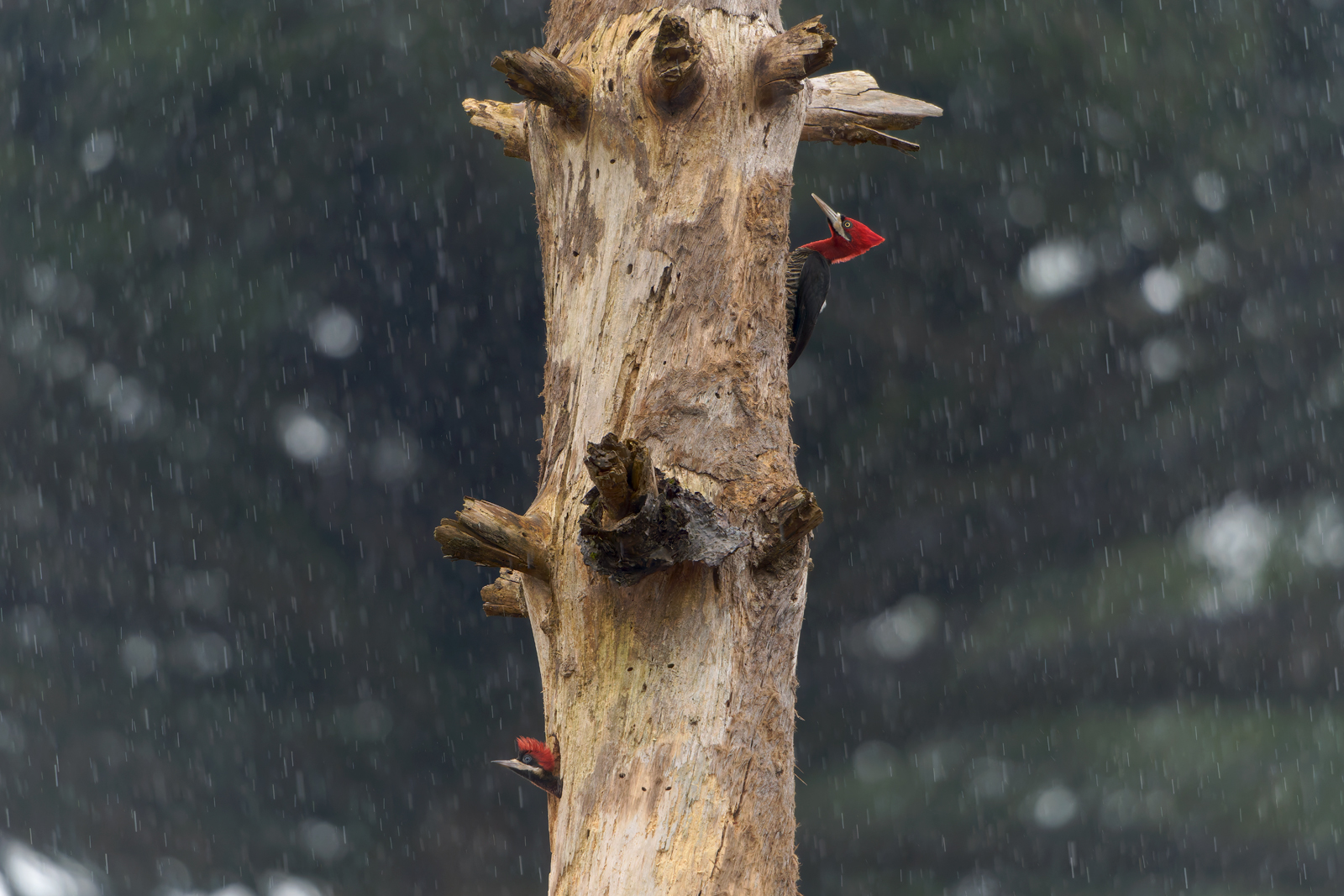 El ultimo día de agosto encontré un nido de carpintero grande a solo 800 m de mi casa, lo que me daba muchas oportunidades de fotos en los ocho días siguientes hasta que el pichón voló. Acá se ve la hembra adulta afuera y el solo pichón, una hembra, mirando afuera, en la lluvia. Foto desde carpa escondite. Les voy a mostrar varias fotos más de la serie.