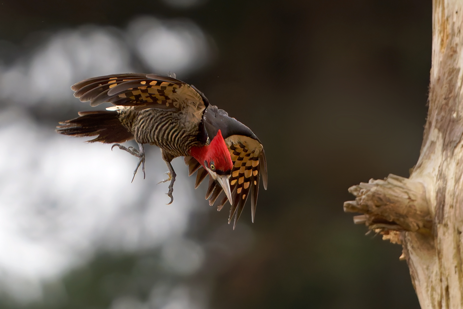 Una hembra de carpintero grande, bajando estilo paracaídas hacia el pie del árbol en que estaba perchada más arriba.