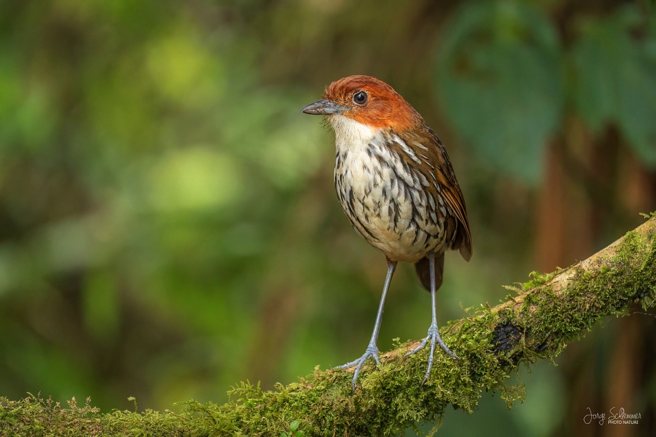 Su plumaje llamativo hace que esta especie sea inconfundible en su rango: cabeza rojiza brillante, garganta blanca y partes inferiores rayadas.